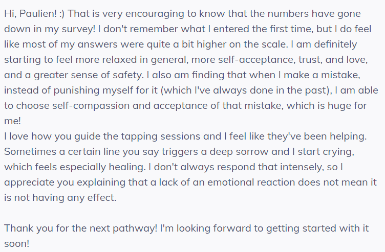 After the first pathway you get assigned further pathways based on your answers. These heal a wide variety of things, from codependency to procrastination, from perfectionism to waking up relaxed and rested.